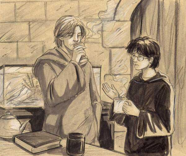 - No i co? - (...)- Co widzisz? - Było nieznośnie gorąco, a w nosie czuł przykre pieczenie od wdychania wonnego dymu unoszącego się z kominka. Postanowił wziąć przykład z Rona i udawać, że coś widzi.