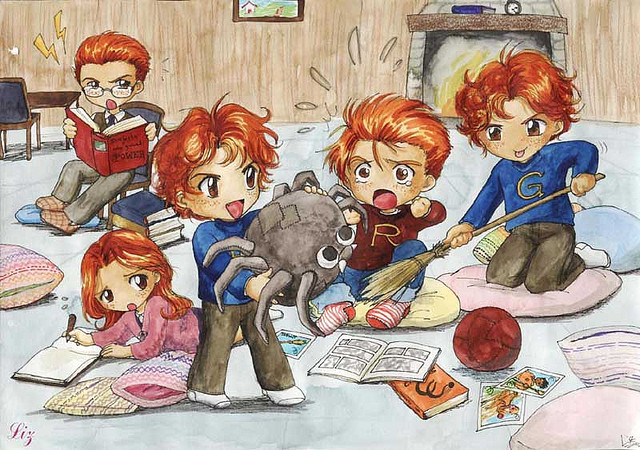 - Oppugno! - dobiegł ich piskliwy głos od drzwi. Harry odwrócił się szybko i zobaczył, że Hermiona celuje różdżką w Rona. Stadko ptaszków jak puchate, złote kule pomknęło ku Ronowi, który krzyknął i zakrył twarz dłońmi. Ptaszki nie dały jednak za wygraną, dziobiąc i drapiąc pazurkami każdy kawałeczek ciała, który mogły dosięgnąć.